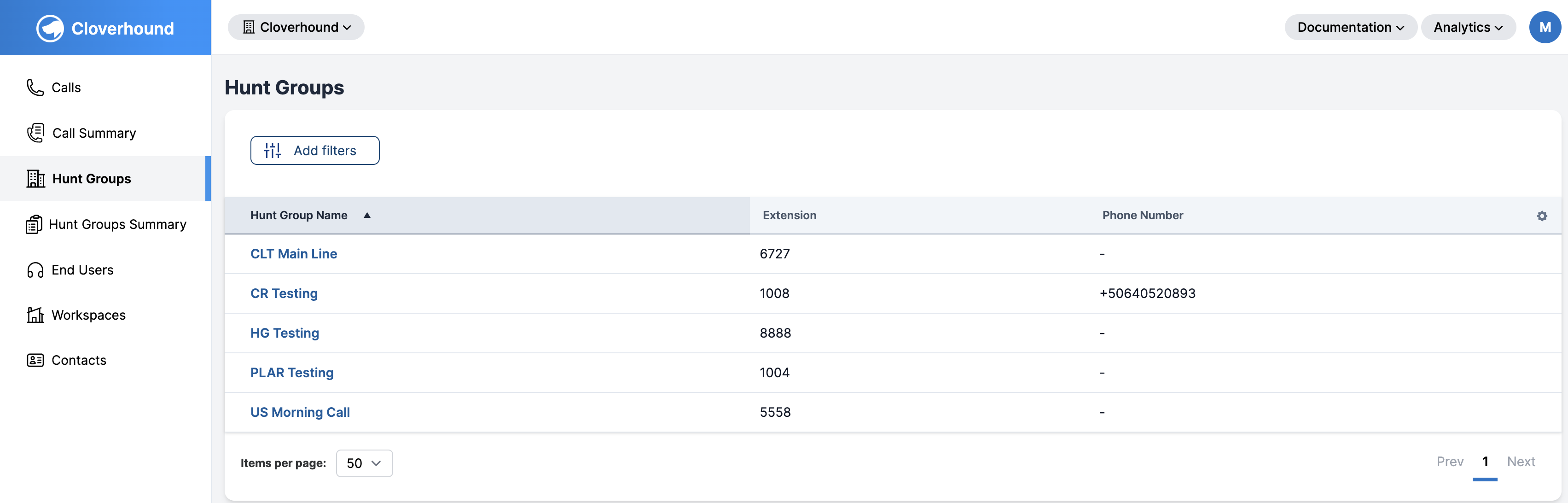 To view hunt groups, navigate to the Hunt Groups Module in your Cloverhound Cloud dashboard. From there, you can apply filters to refine the displayed list and quickly locate specific hunt groups.